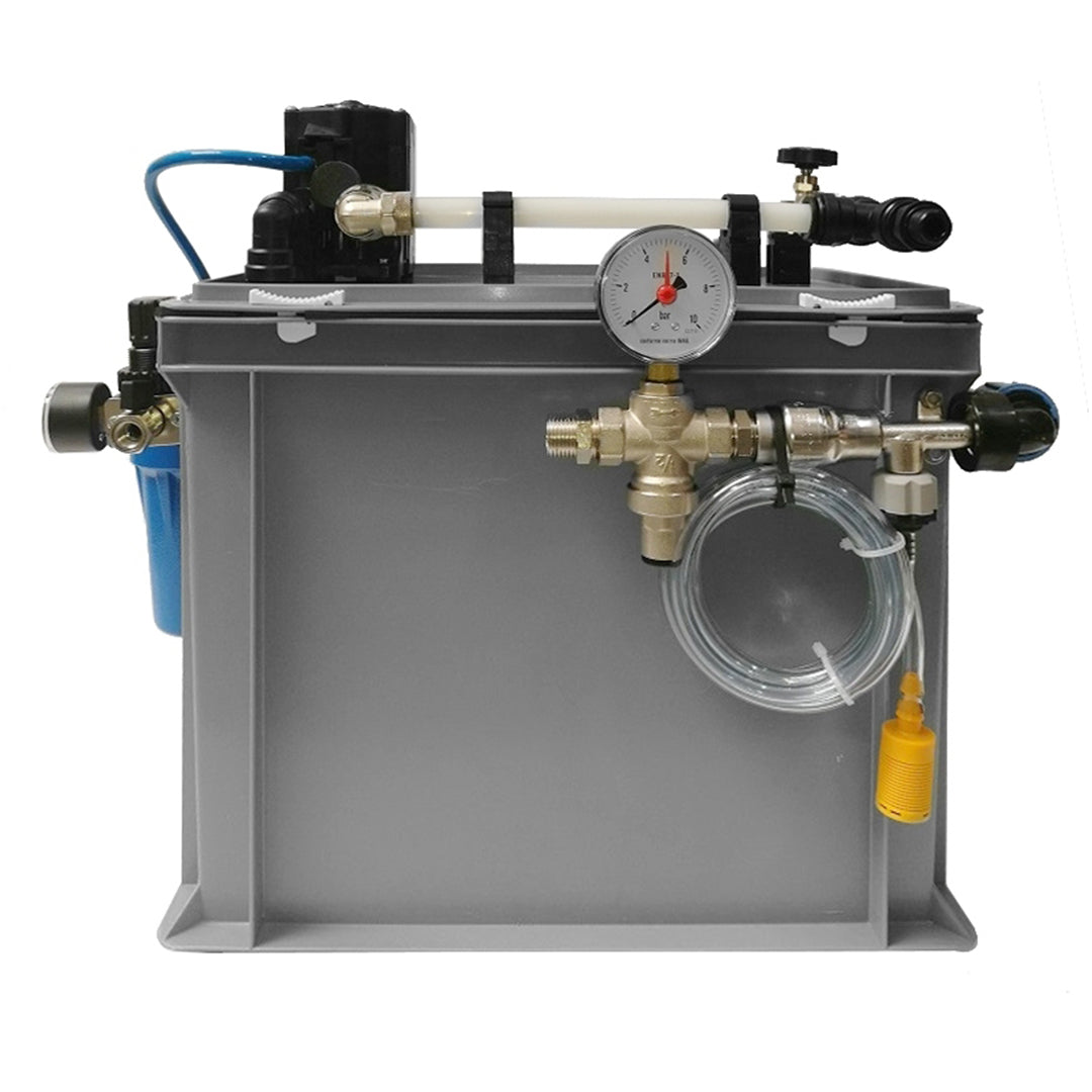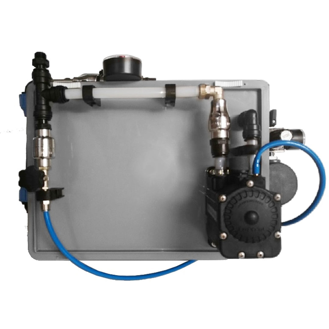Il gruppo schiumogeno, montato sulla vaschetta, si compone invece di una pompa pneumatica Flojet autoadescante, di un regolatore di pressione aria con manometro e di un separatore di condensa. L'aria compressa viene utilizzata per alimentare la pompa e per creare la schiuma agendo sul rubinetto a volantino che consente di regolarne la densità.