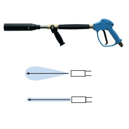Lancia schiumogena a lunga gittata per applicazioni antincendio, dotata di regolatore centrale per regolazione dell'angolo del getto e di diffusore con sistema Venturi per erogazione di acqua o prodotto schiumogeno. Impugnatura tipo PA RL51 heavy duty con apertura servo assistita.